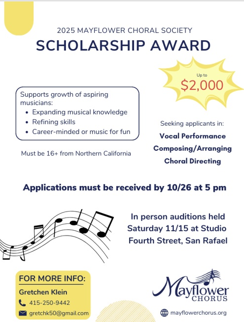 Cash scholarships of $250 or more will be awarded to people studying or strongly interested in Vocal Performance, Composing and Arranging, or Choral Direction. Northern California candidates age 16 or older, any musical style, any background, may apply. In-person auditions will be held on Saturday, November 15, 2025 in San Rafael. Winners may be featured at Mayflower Chorus events and shows.